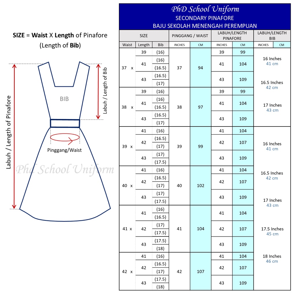 Waist 37 Length 39 41 43 Bib 16 16 5 17 Phd School Uniform Secondary Dress Pinafore Baju Sekolah Menengah Perempuan Shopee Malaysia